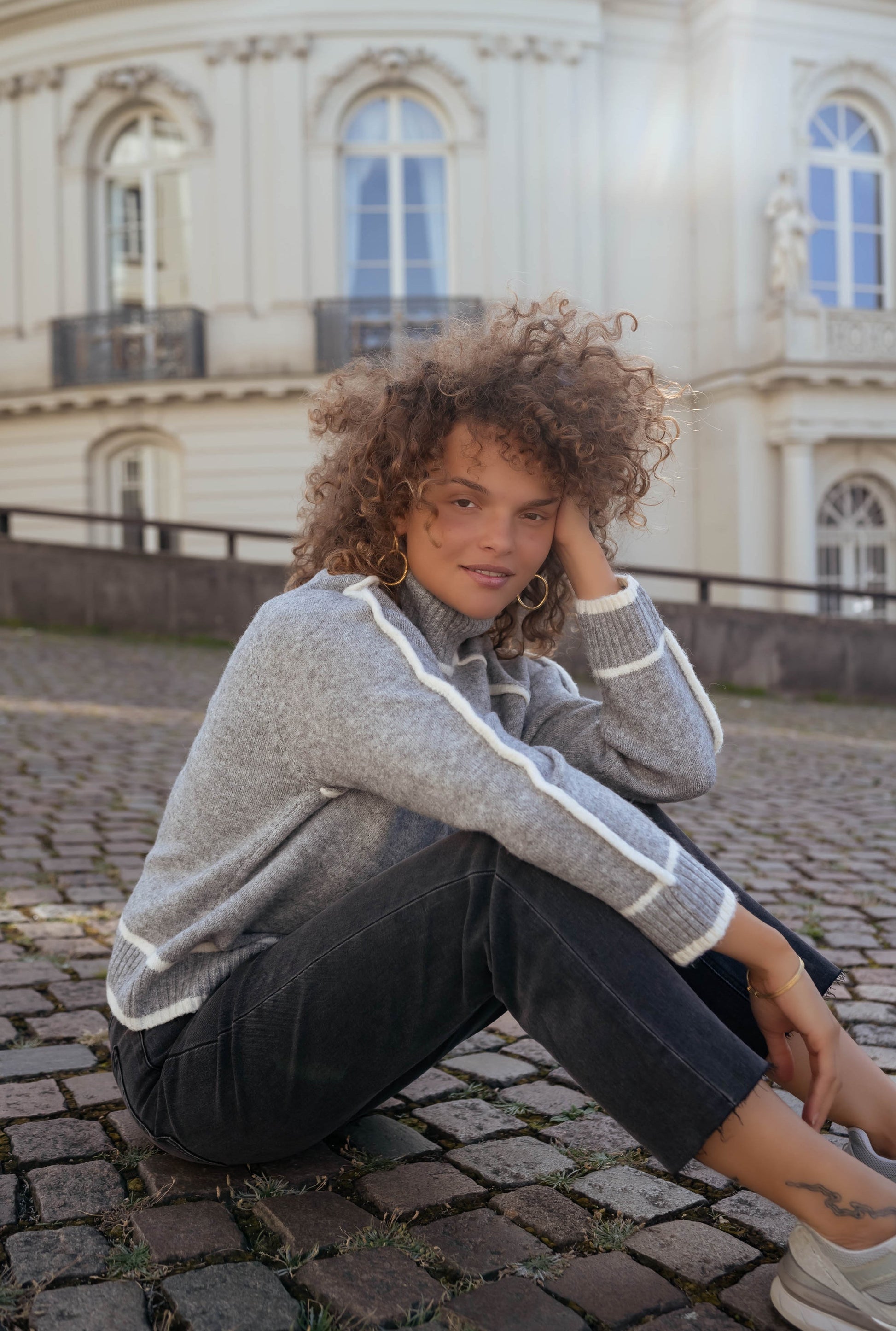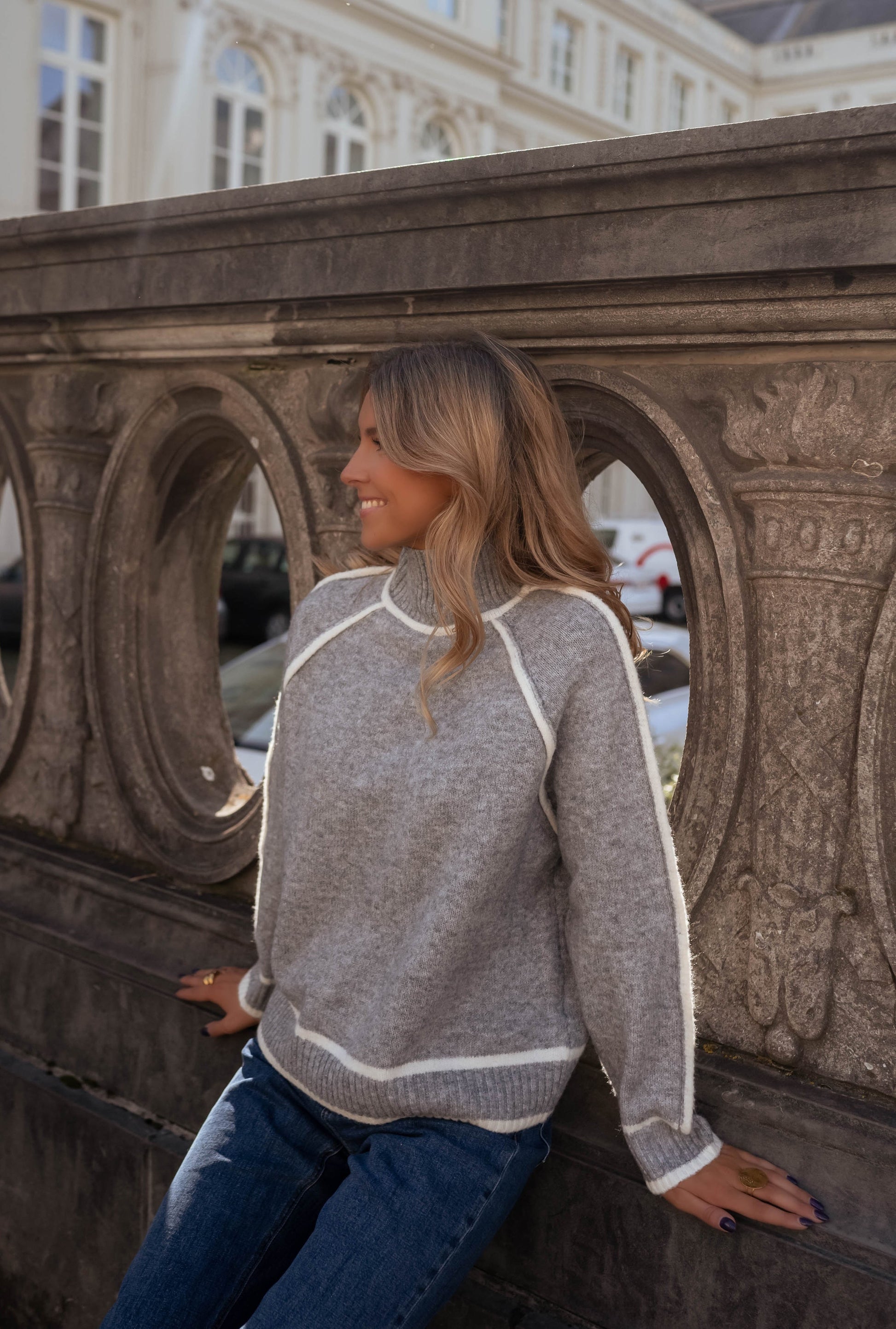 Vom Office-Morgen bis zum Dinner am Abend: Zu Wollrock und Stiefeln wirkt Amelie kultiviert, zur Denim lässig-edel, unter dem Blazer smart und klar. Der zurückhaltende Grauton und die ecrufarbenen Details machen jeden Look mühelos day-to-night-tauglich.