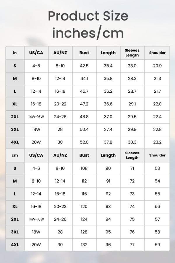 | Zoll | US/CA | AU/NZ | Brust | Länge | Ärmel | Schulter |