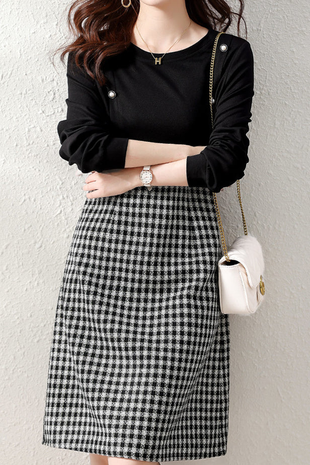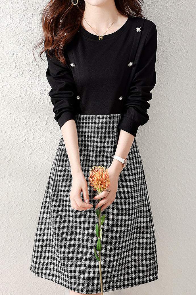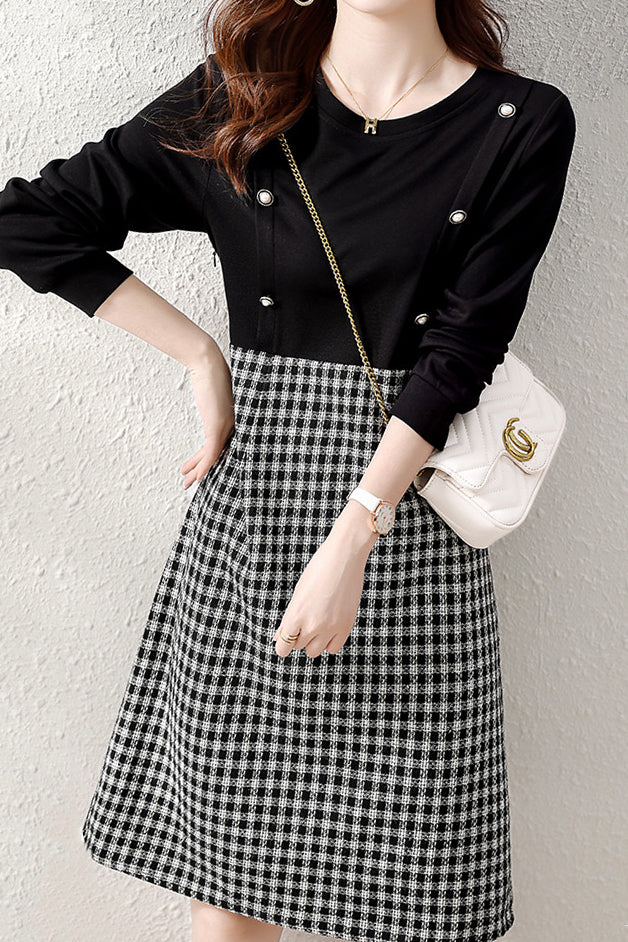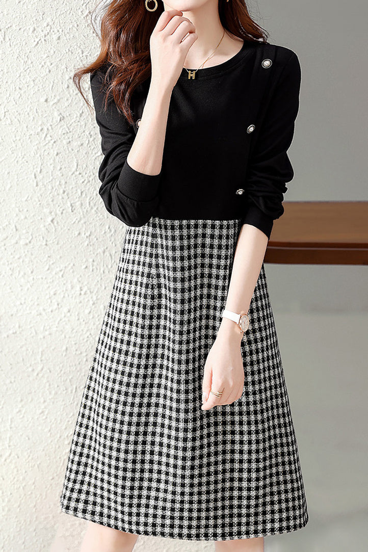 Runder Ausschnitt, Knopfdekoration, Karodocking, ausgestellte Silhouette, knielang, lange Ärmel |