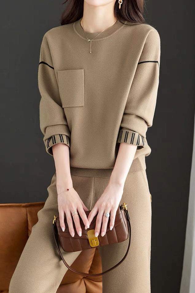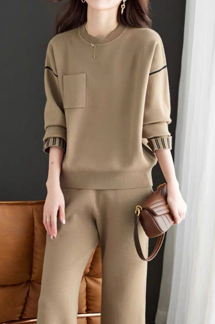 Luxuriöses Gefühl, Strickmaterial, runder Hals, gestreift, lange Hose, lange Ärmel, Set |