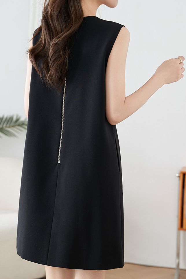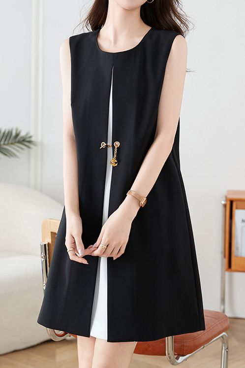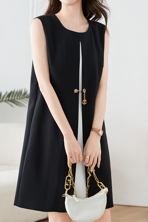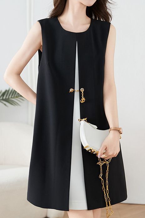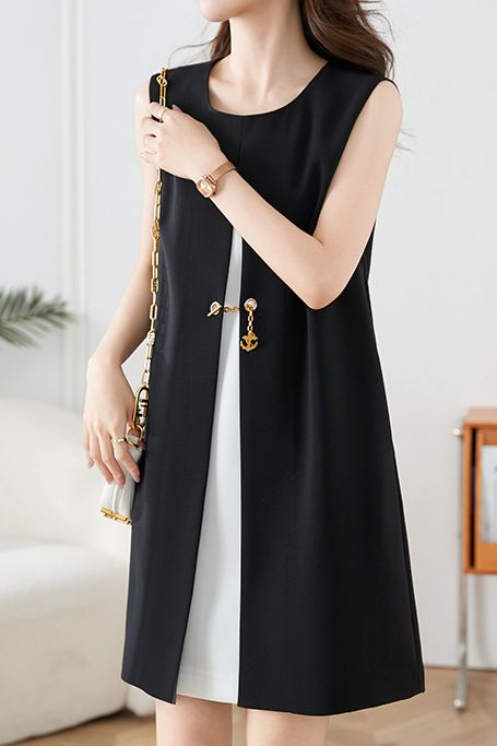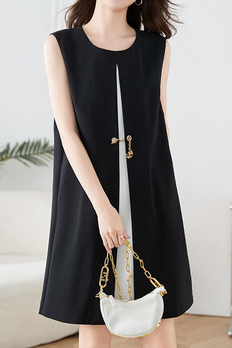 Ein Kleid mit rundem Ausschnitt und ärmellosem Design, featuring eine schwarz-weiße Farbblockierung vorne, einen metallischen Kettengürtel zur Anpassung in der Taille und einen Reißverschluss auf der Rückseite. |