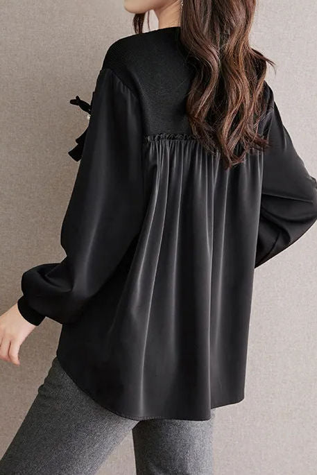 Strickoberteil, Rundhals & Langarm lockere Version, Bow-Patchwork auf der Vorderbrust, Rüschendes Patchwork auf dem Rücken |