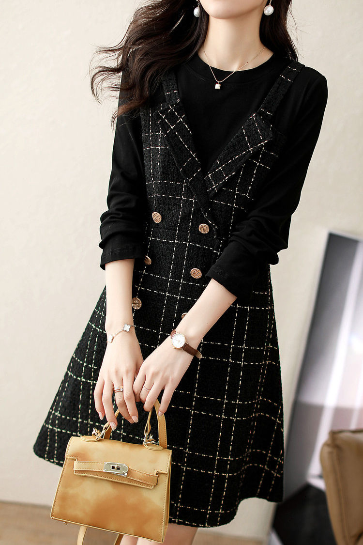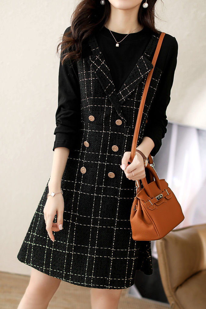 Exquisites elegantes Fake-Zweiteiler-Karomuster-Kleid mit langen Ärmeln