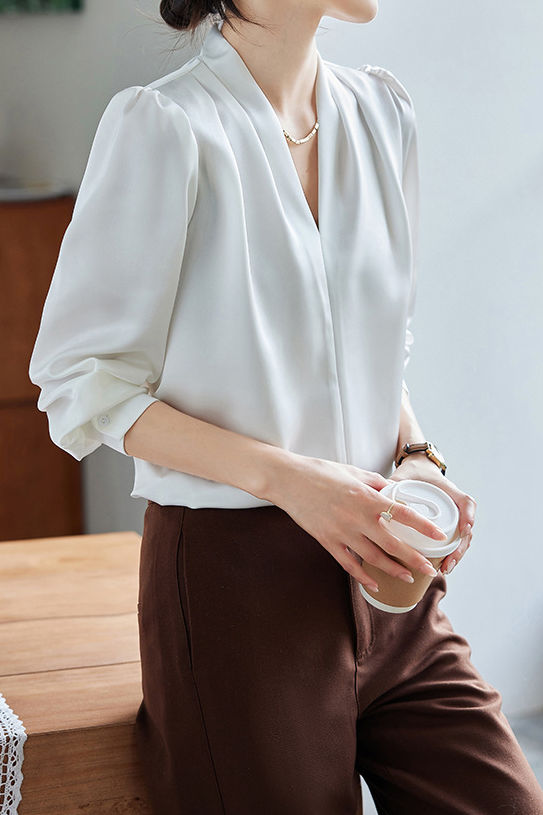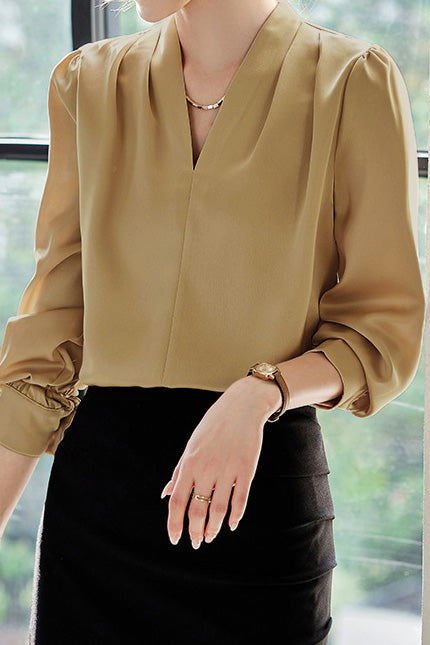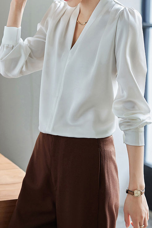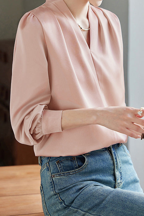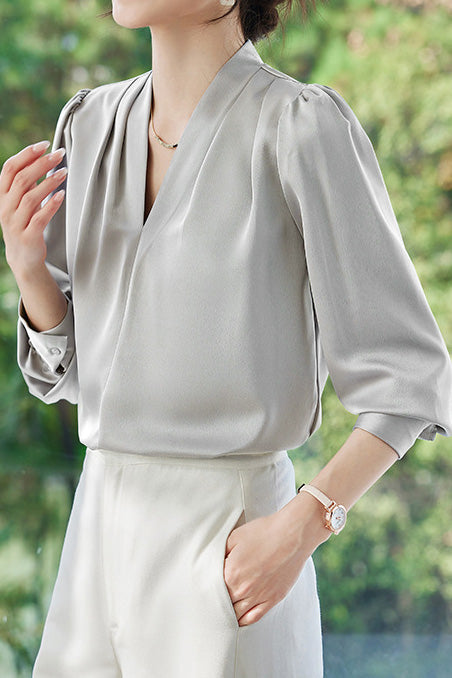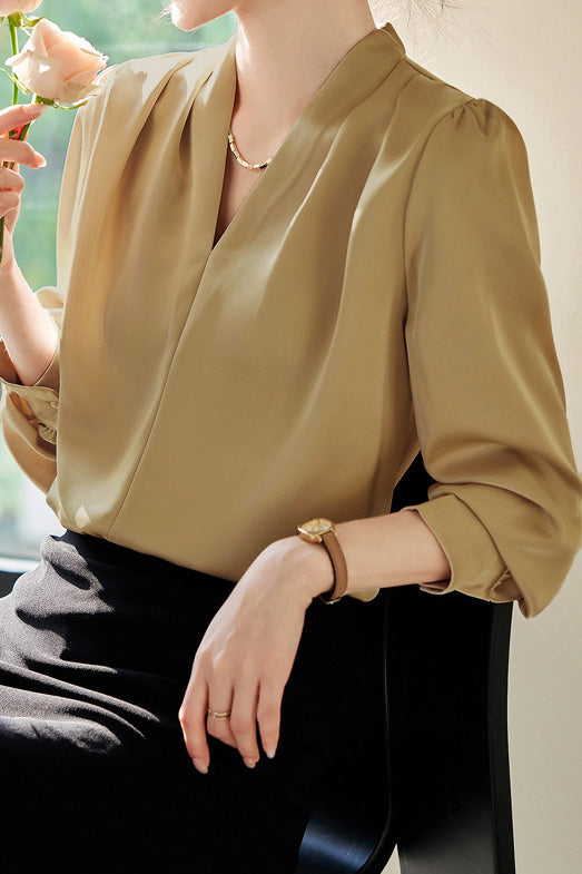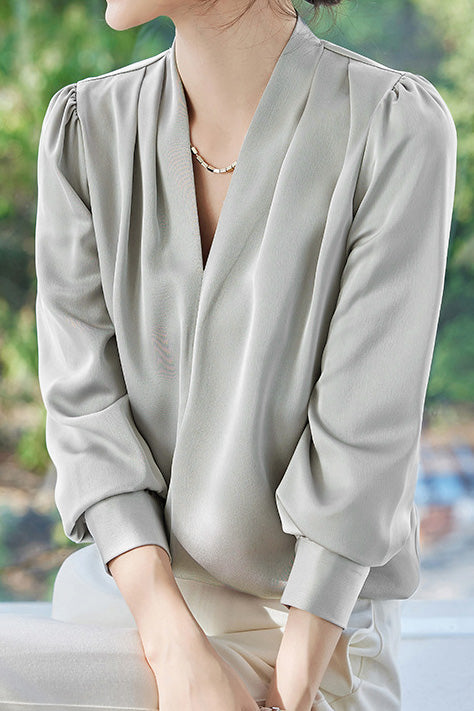 Exquisites Langarm V-Ausschnitt Satinhemd
