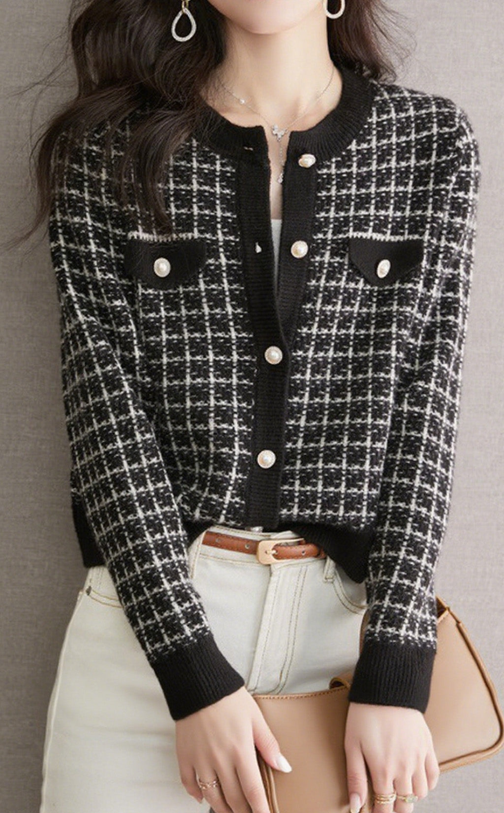 Strickjacke, Rundhalsausschnitt mit abnehmbaren Knöpfen, lange Ärmel, garngefärbte Karierte Textur |