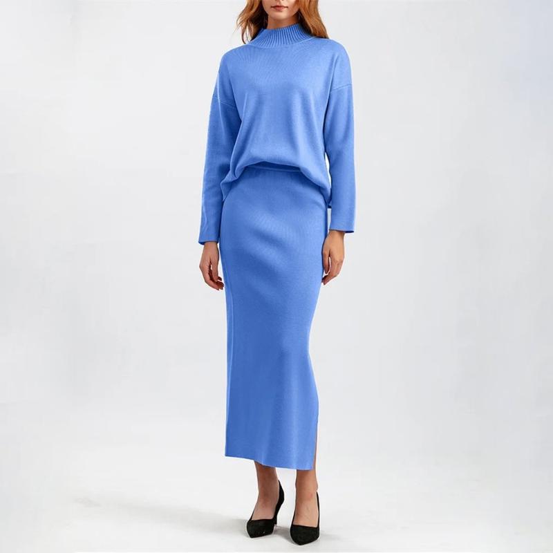 Dieses Strickpullover- und Rockset vereint mühelose Eleganz mit ganztäglichem Komfort. Der weiche Stretchstrick fällt wunderschön, mit einem lässigen Oberteil und einem eleganten Rock mit Schlitzsaum für eine raffinierte Silhouette. Perfekt für sowohl lässige als auch schicke Looks, bietet es zeitlose Eleganz in jedem Detail.
