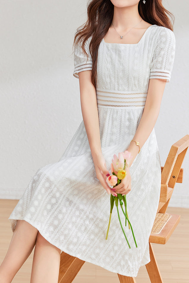 Ein Kleid aus zarter Spitze mit Gänseblümchenmuster und Futter, mit ausgeschnittenem elastischem Spitzenbesatz an der Taille und den Ärmeln, einem quadratischen Ausschnitt, puffigen Kurzärmeln, einer taillierten Taille, einem A-Linien-Saum und einem unsichtbaren Reißverschluss in der Mitte des Rückens. |