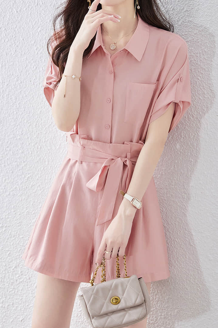 Knopfleiste Kurzarmhemd mit Taillenschnürung und plissierten Shorts, Hemdkragen mit Frontöffnung, funktionale Knöpfe, linke Fronttasche, verbundene Ärmel, verstellbare Knopf-Schlaufe am Ärmel, versteckter Reißverschluss an der Shorts-Seite, plissierter Bund mit Schnürung |