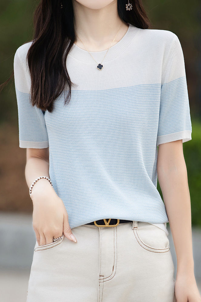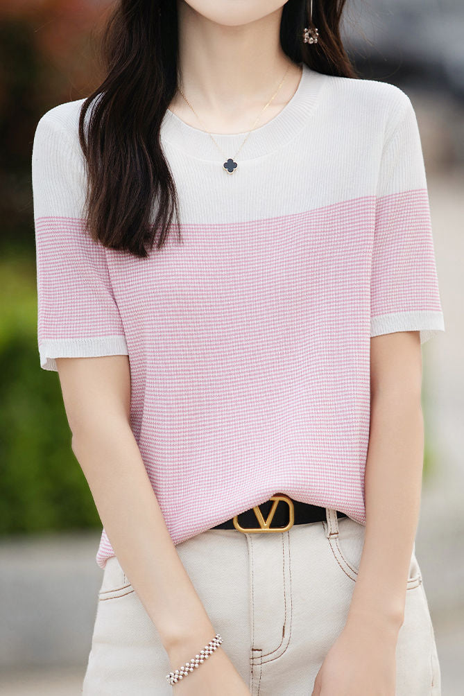 Strickoberteil, runder Hals mit kurzen Ärmeln, Farbblock-Pinstripe-Design |