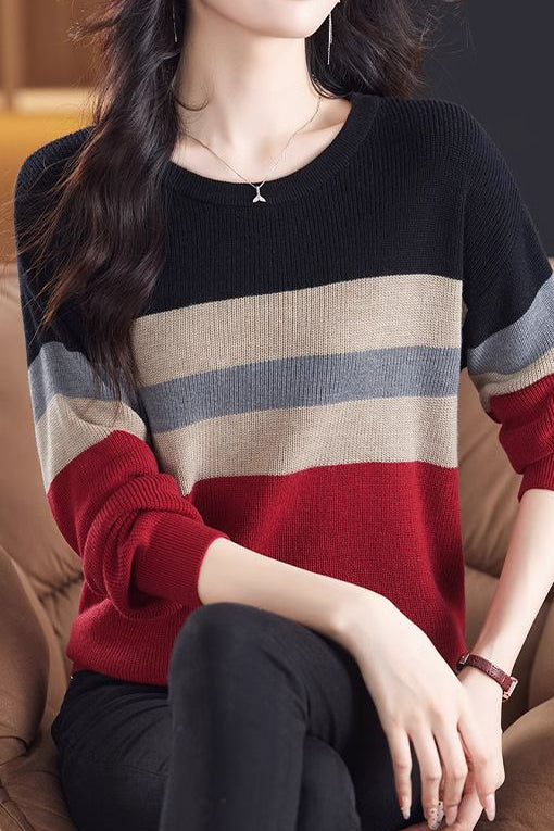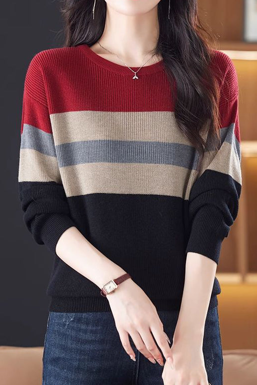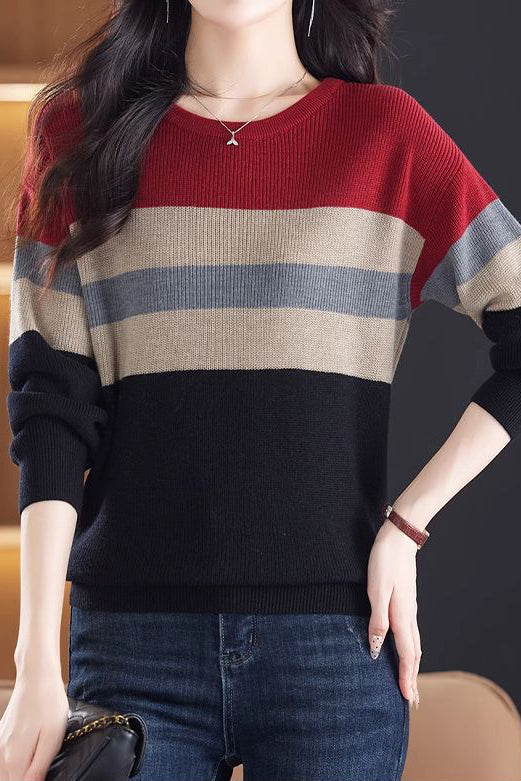 Lässiger Rundhals-Farbblock gestreifter Pullover mit langen Ärmeln