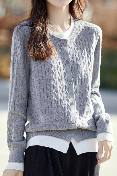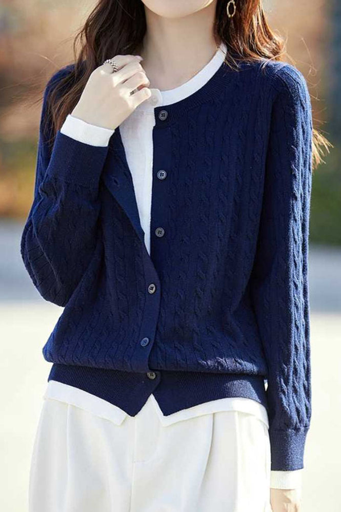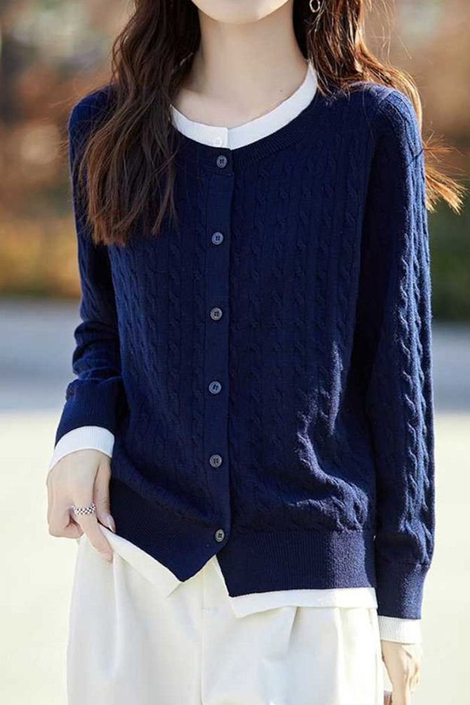 Strick-Cardigan: Rundhalsausschnitt, zweilagiger Knopfverschluss vorne, lange Ärmel, farbblockiertes Patchwork-Fake-Zwei-Teile-Design. |