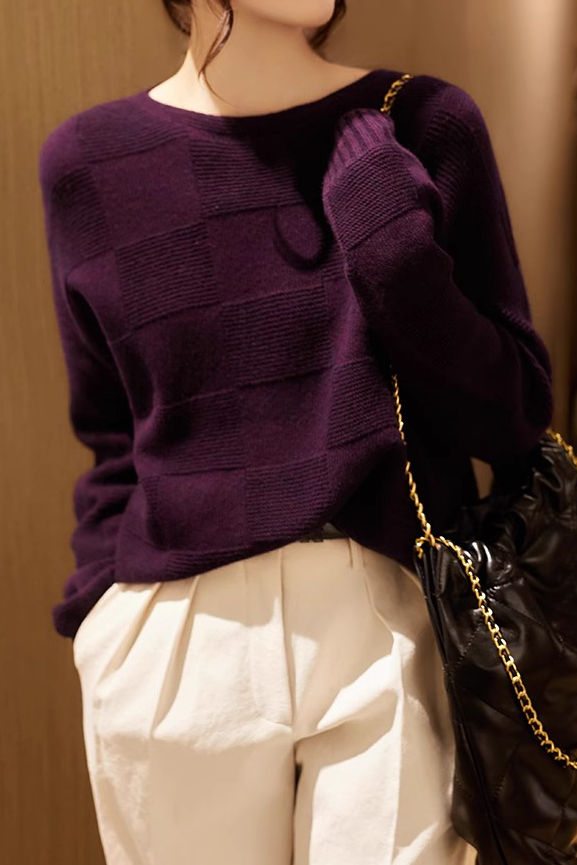 Strickoberteil, Rundhalsausschnitt, abfallende Schultern, lange Ärmel, karierte Stoffgestaltung, einfacher einfarbiger Stil |