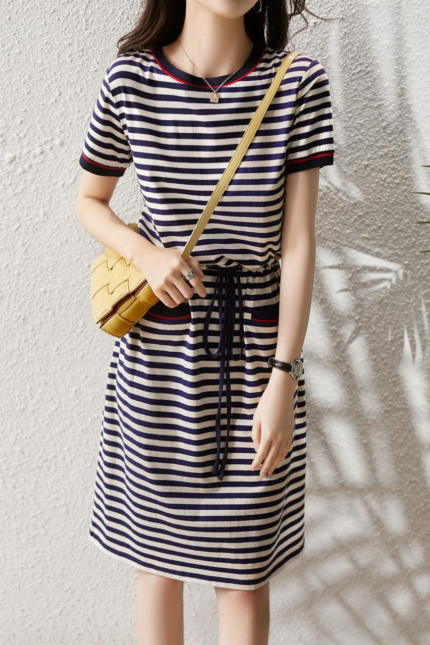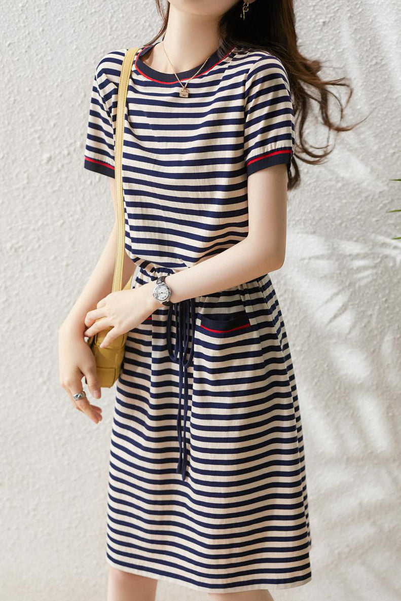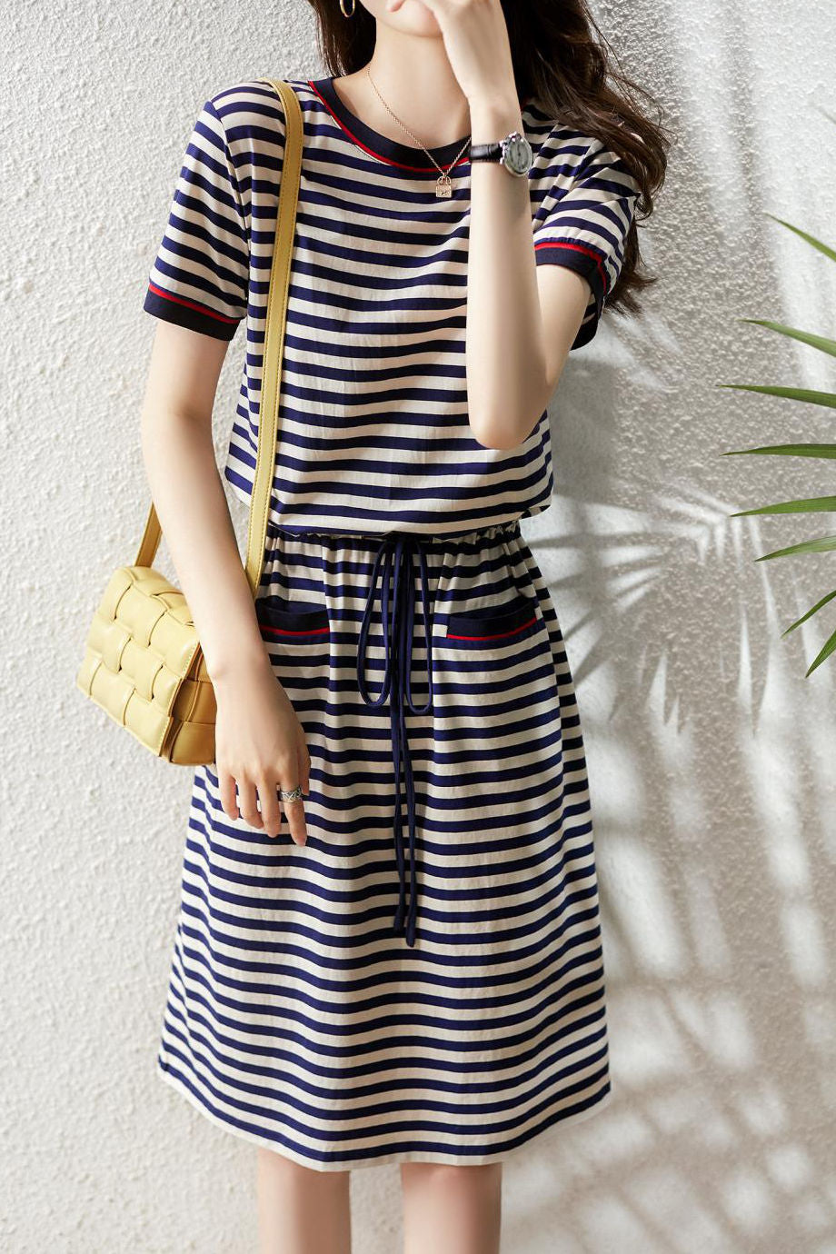 Kleid mit einem garngefärbten Streifenmuster, rundem Hals und kurzen Ärmeln, mit einem Kordelzug in der Taille und einer vorderen Taillen-Tasche. |