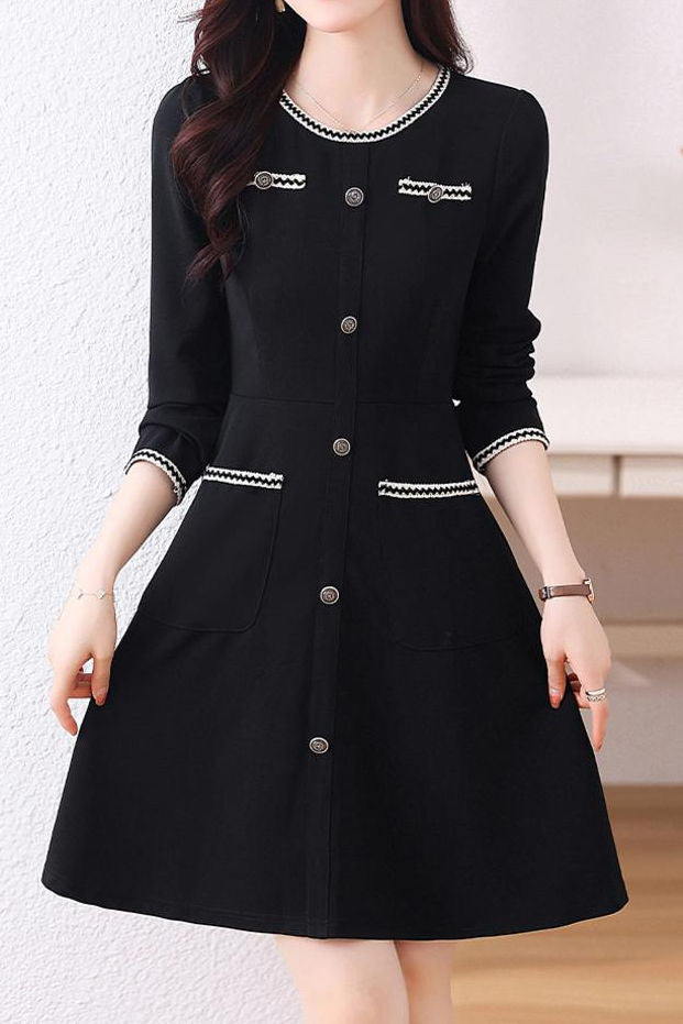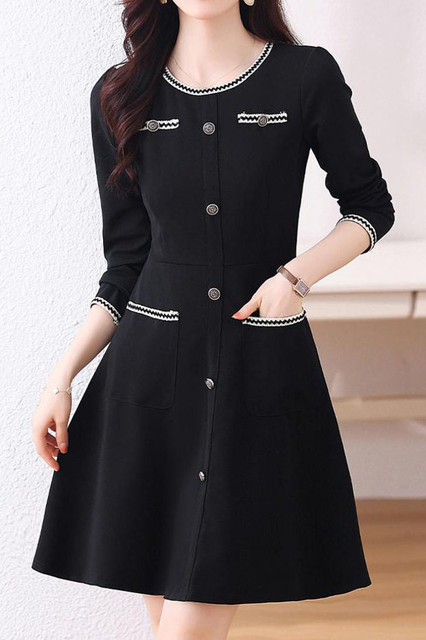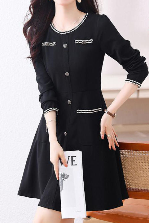 Kleid, Rundhals, Lange Ärmel, Bestickter Ausschnitt, Besticktes Patchwork-Ärmeldesign, Knopfmanschetten, Unsichtbarer Reißverschluss hinten, Leicht taillierte Passform, Taschen an beiden Seiten |
