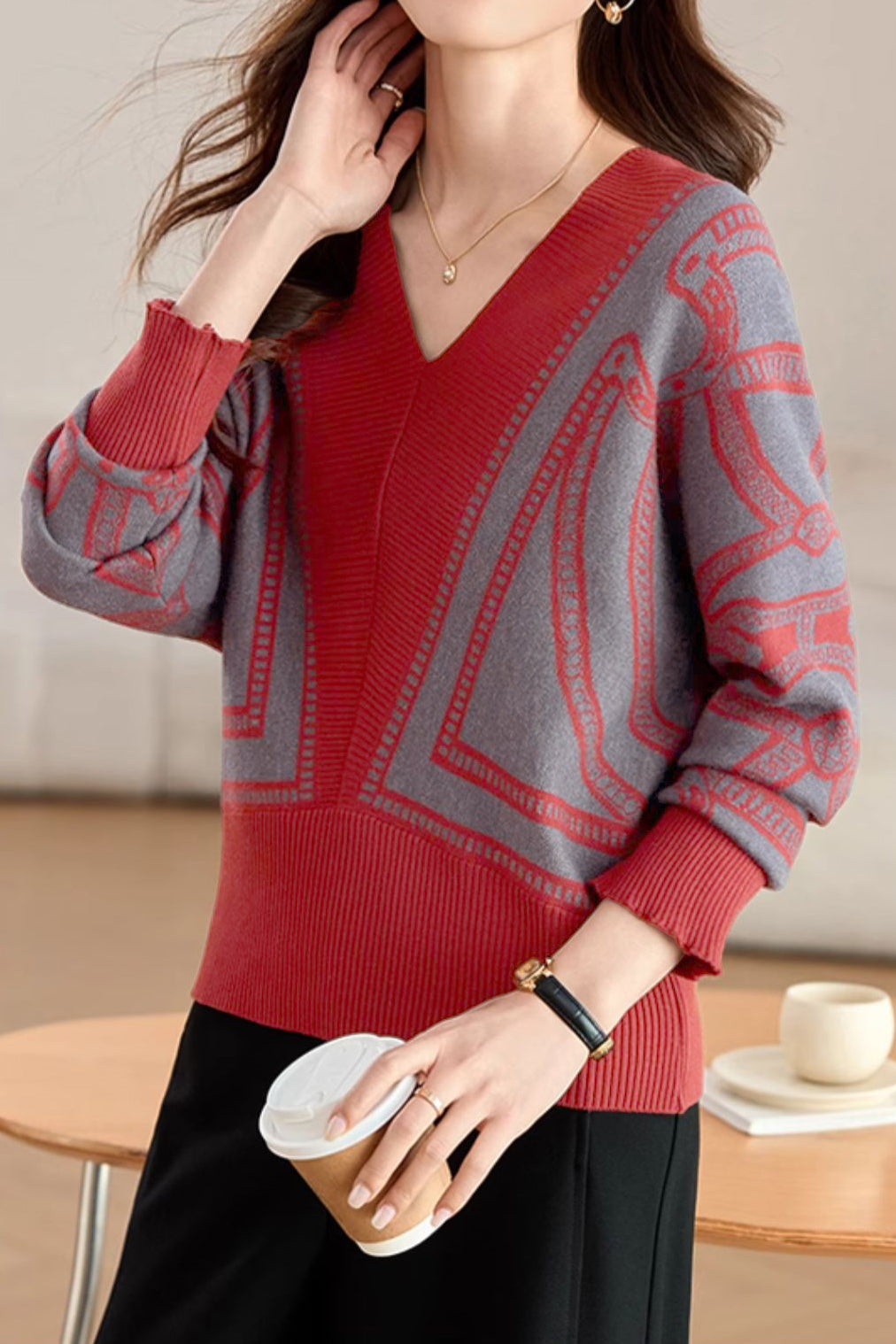 Stricktop, V-Ausschnitt, Raglan-Langärmel, lockere Passform, gemustertes & einfarbiges Blockdesign |
