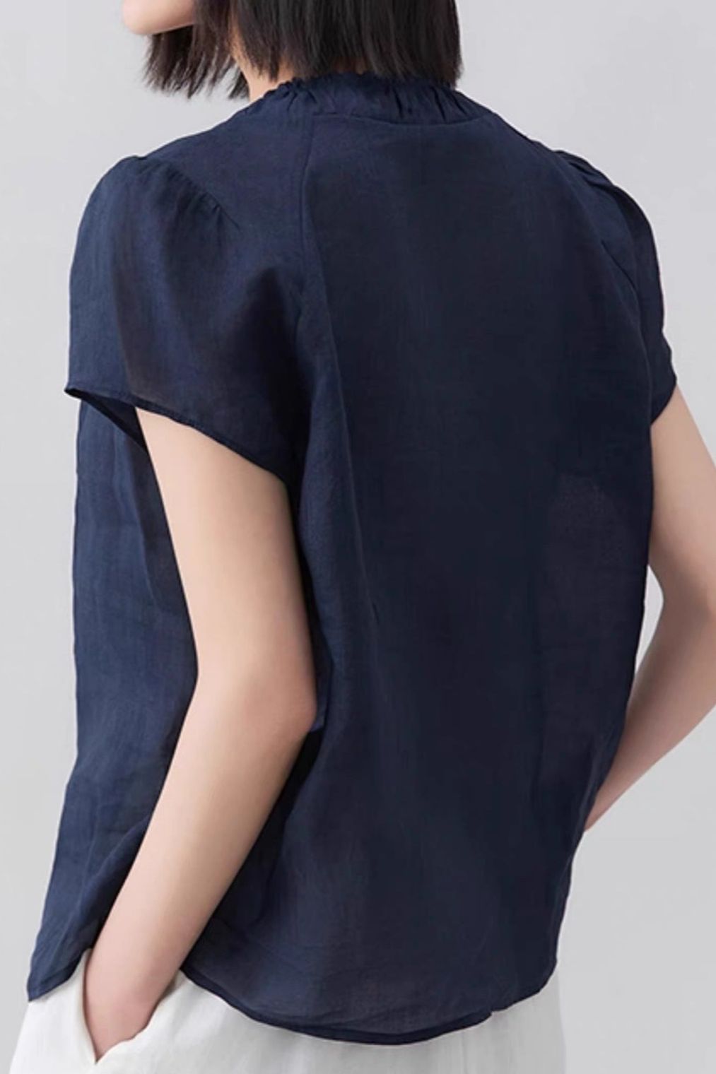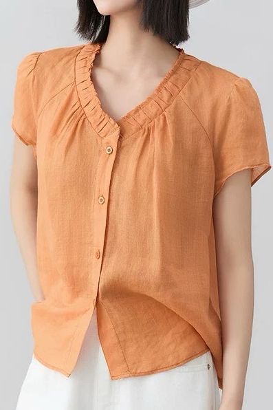 Hemd mit V-Ausschnitt, funktionalen Knöpfen, gerafftem Ausschnitt, Raglan-Kurzärmeln, einfarbig und locker sitzend. |