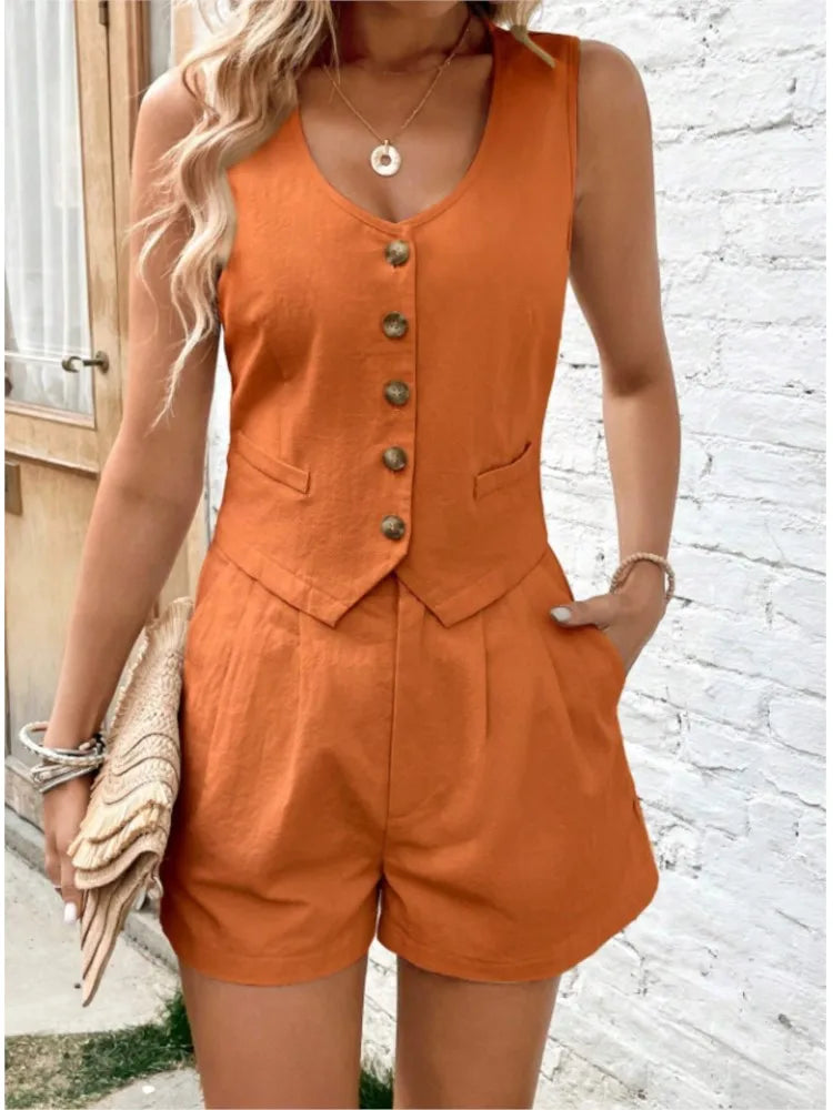 Maßgeschneidert für sonnenverwöhnte Ausflüge und raffinierte Kurzurlaube, kombiniert dieses zweiteilige Set aus Leinenmischung eine sculptierte Weste mit Knopfleiste mit hoch taillierten, gefalteten Shorts für eine elegante Silhouette. Entworfen mit klaren Linien, luxuriöser Textur und einem Hauch von Vintage-Charme, ist es eine moderne Hommage an die Eleganz der warmen Jahreszeit.