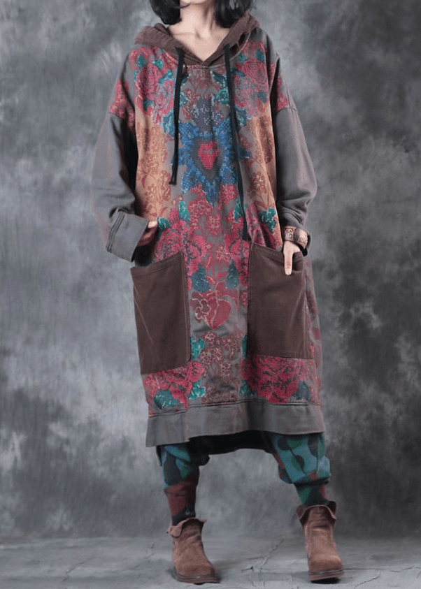 Moderne grüne Druck Baumwollkleidung mit Kapuze und Kordelzug Kunstkleid
