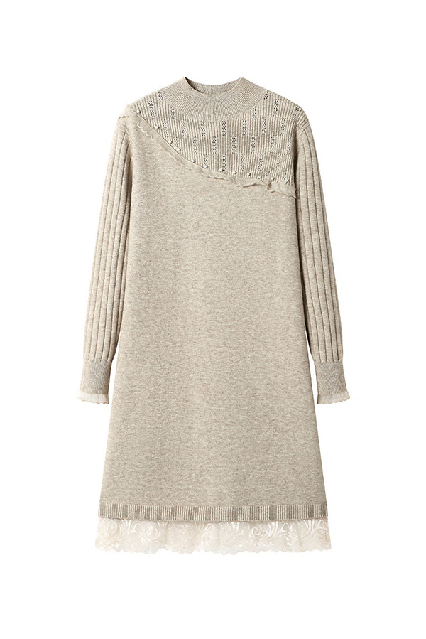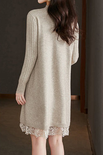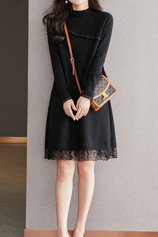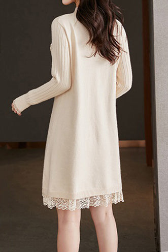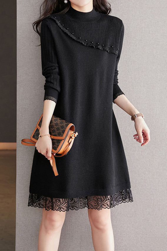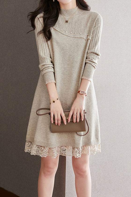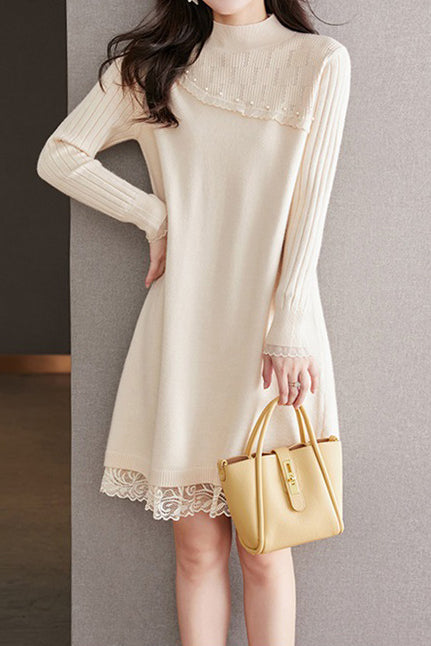 Perlenverzierte Fluss-Spitzen-Kontrast-Strickkleid - 3 Farben erhältlich