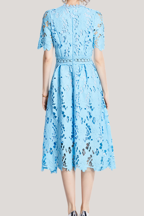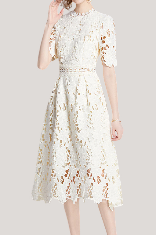 Stark besticktes, wasserlösliches Spitzenkleid in mittellanger, einfarbiger Ausführung, gefüttert, Spitzenbesatz am Ausschnitt und in der Taille, verdeckter Reißverschluss hinten, A-Linien-Silhouette mit zarter, hohler Spitzenstoff |