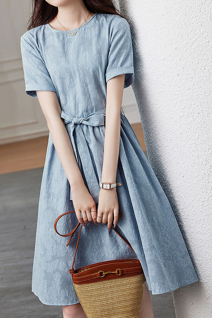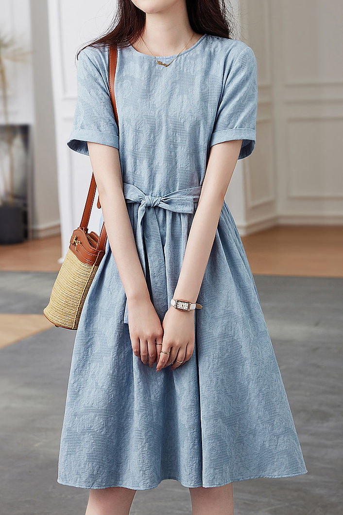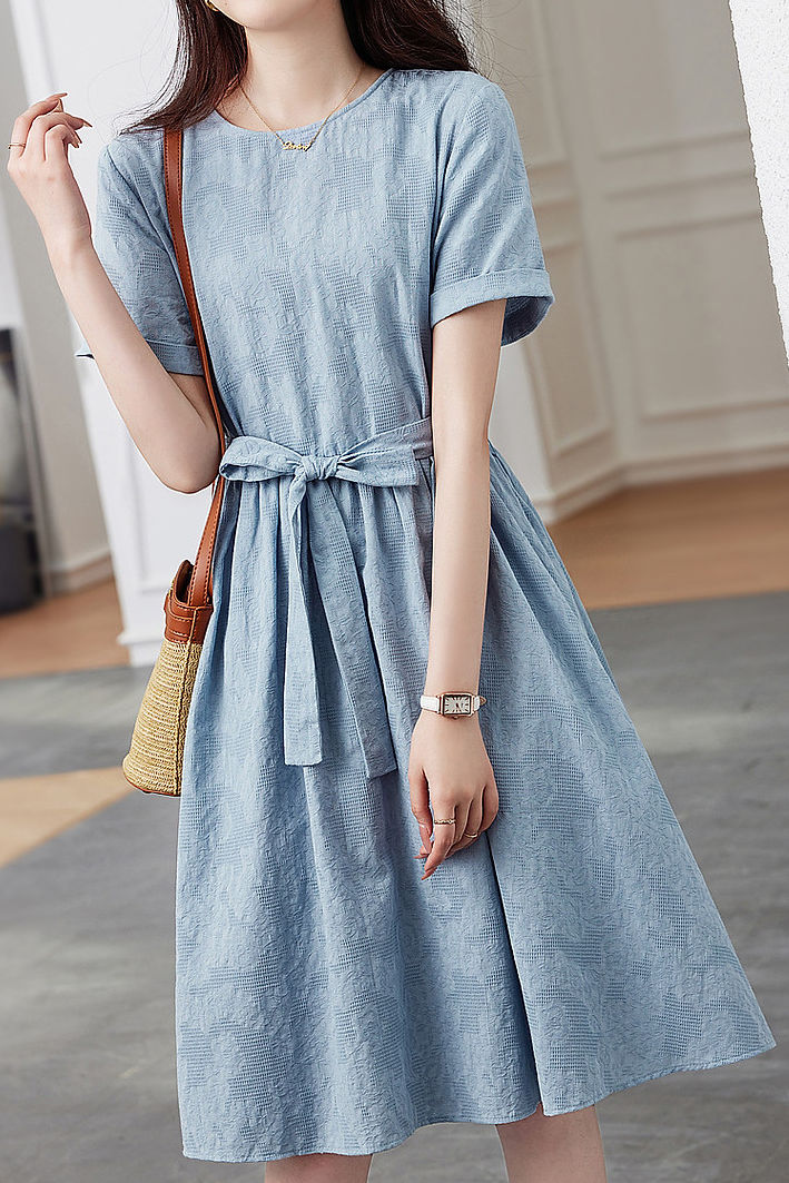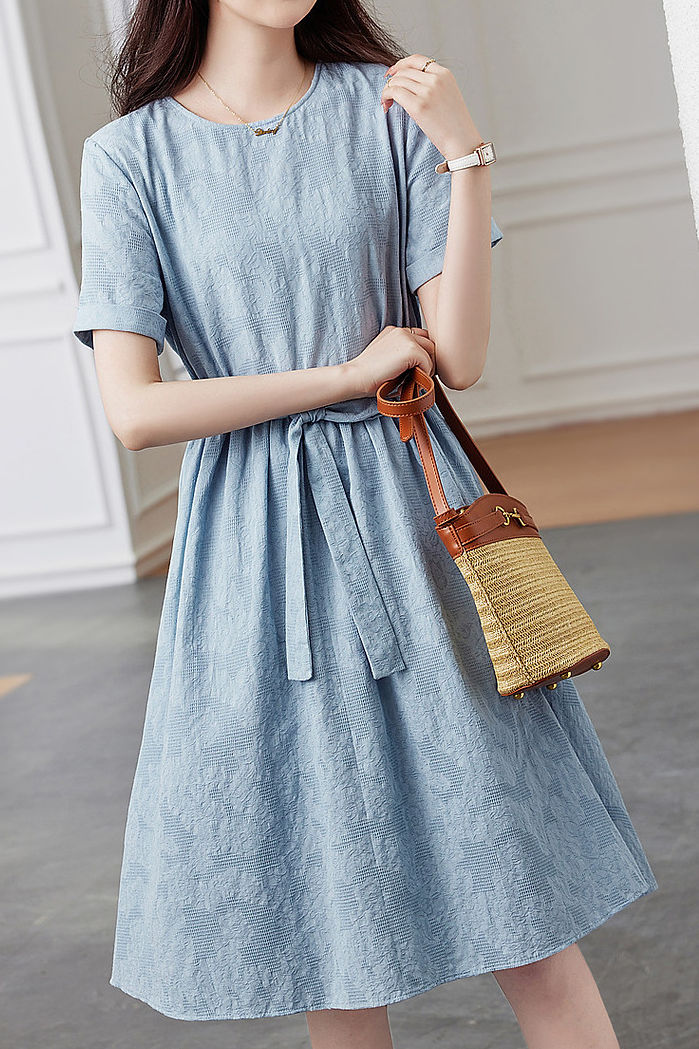 Strukturierte lässige Bindekleid, runder Ausschnitt, strukturierter Stoff, Bindedetail |