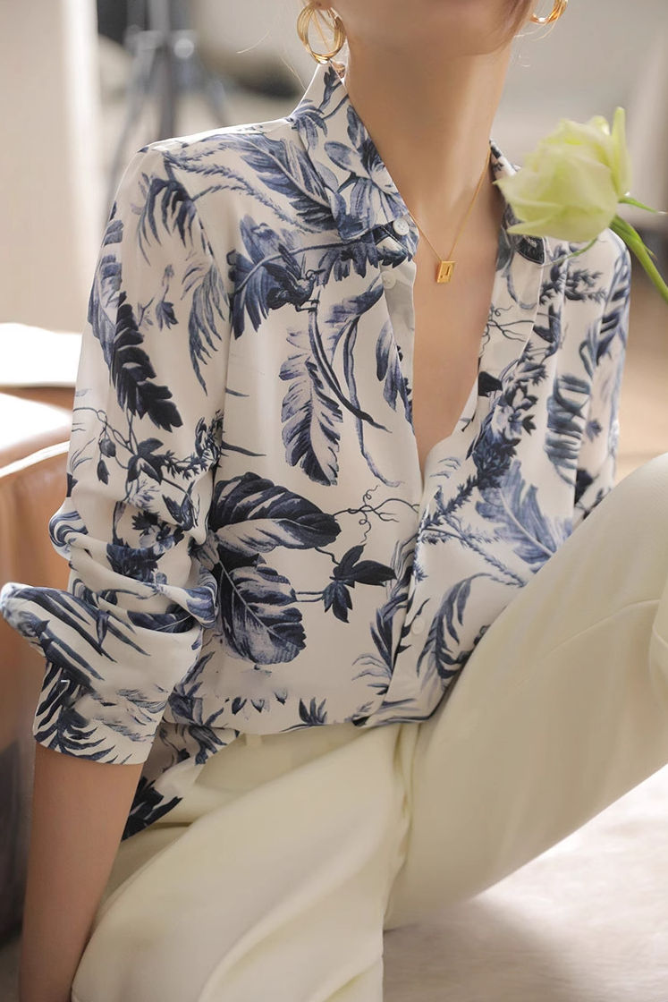 Tintenwasch bedrucktes Hemd mit Knopfleiste und langen Ärmeln mit blauen Pflanzenmotiven, funktionaler Knopfleiste, langen Ärmeln mit Schlitzen und Knöpfen, abgerundetem Saum, Falten am Rücken |