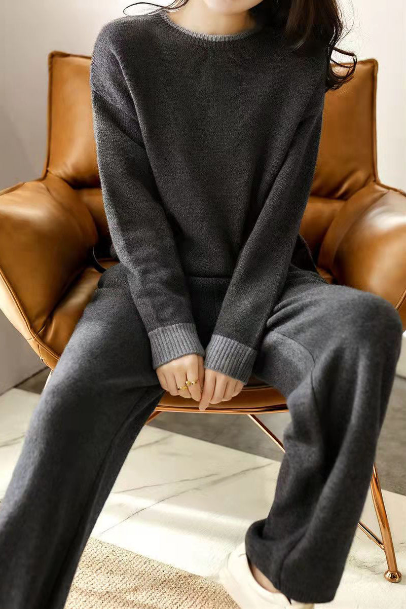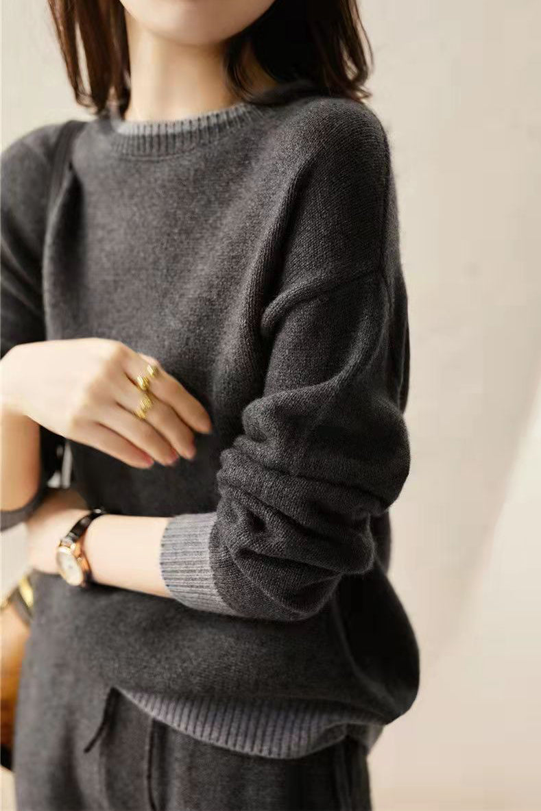 Zwei-Teile-Set: Rundhals-Farbenblock-Strickoberteil + Kordelzug-Farbenblock-lange Strickweite Hose